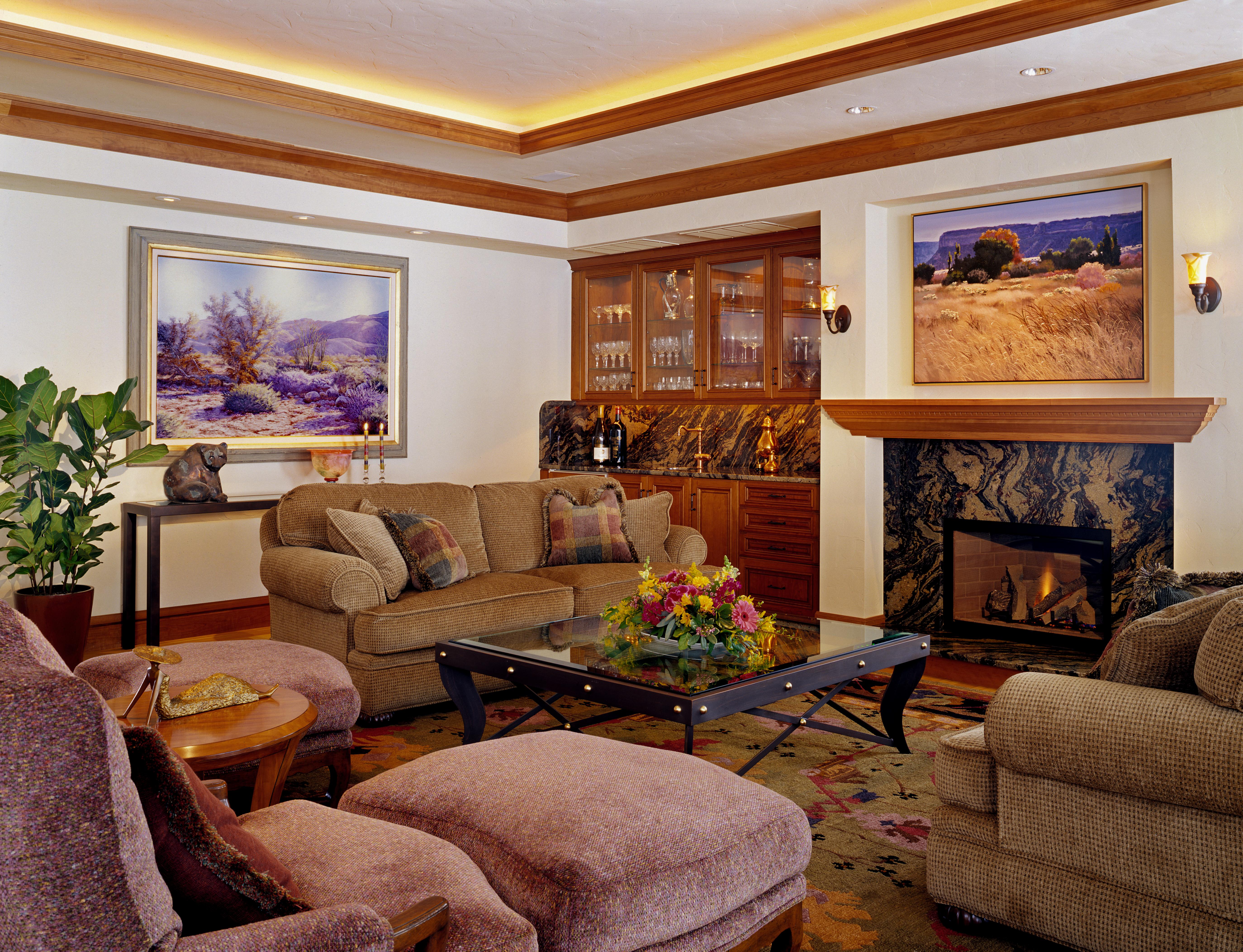 While rustic and very contemporary architecture offer their own challenges, so does more traditional architecture. We wanted the lighting effects to be very crisp and clean yet not at all cold and stark. Layering of lighting elements such as cove lighting, art accents, decorative elements and even table and floor lamps achieve this. We always want the light sources themselves to be as unobtrusive as possible.