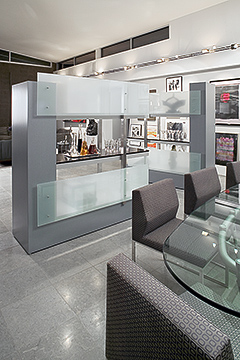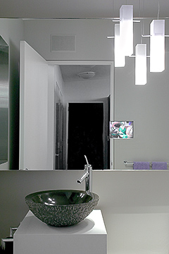 The very clean lines of this contemporary home, along with the owner and architect’s desire to have all the elements be very real and honest, gave direction to our lighting approach. We chose not to conceal the accent fixtures, as the client wanted maximum versatility for the lighting of his art collection.
